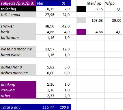 On the internet you will find the average use in % per object. What we see is that 45% is for the bathroom to wash