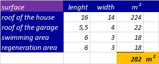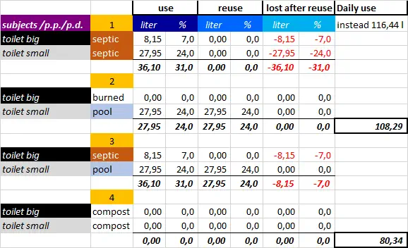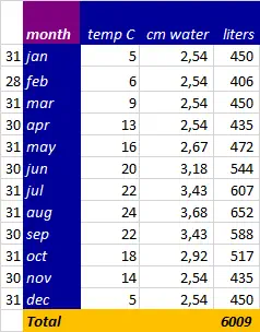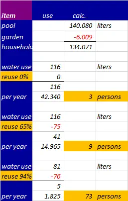 Challenge calculation swimming area To calculate the size of the swimming area you have to find out the influence of the next subjects: - rainfall; - roof & pool surface; - evaporation; - household use; - remainder household; - garden botanica; - buffer. rianfall If you want to know how much rain falls in a country, there are many websites who will give you these information. e.g. https://klimaatinfo.nl/klimaat/frankrijk/ I have searched for a region and gave about 750 mm/y. roof & pool surface Now we can calculate how much water we have: 282 m 2 (surface) x 0,75 mm/y (rainfall), gives 211.500 liters/y. evaporation Because of the wind, the temperature, humidity and sun, the water will evaporate. To calculate I have found a site: https://www.lenntech.nl/calculators/verdamping.htm The evaporation is in mm/month of the surface of the swimming area and the regeneration area. I calculated it was an average of 5,84 mm/day. Later I found a site: https://dengarden.com/swimming-pools/Determine-Evaporation-Rate-for-Swimming-Pool who speaks of a ‘rule of thumb’. You loose a quarter of an inch of the surface a day. 2,54 cm/4 gives 6 mm a day. I can live with that. The swimming area and the regeneration area gives a total of 36 m 2 So the lost per year is 3.600 dm 2 x 0,06 dm/day x 365 days gives 78.840 liters/y. It means a lost of 37% in a year. So if this is the situation than you can use 211.500 -/- 78.840 = 132.660 liters/y. I calculated in normal circumstances that a person use 42.500 liter a year. It is just enough for 3,1 persons/y. I also calculated the evaporation with a swimming area of 8 x 11 m and the evaporation was almost 80%. But when you cover the swimming area (18m 2 ) the lost by evaporation will be 19% instead of 37%, and the enough for 4 p/y. So you can win a lot by covering the swimming area. household use Let us remind the use of the water at this moment. It is 116,44 liters/d. What can we reuse? remainder household purple items The purple items, 4%, it’s a loss and not reusable. There is the urine as a by-product and when you cook with water a part will be poured off. I’m not calculating so in practice it is an extra. grey items From these items I only have at this moment a question mark by ‘toilet small’. The rest is reusable, if you uses biodegradable products. It gives a saving of 75 liter/pp/d (65%). We have to find out which products these are and which criteria there are to connect it into the regeneration area. toilet: This item is more complex because of the different kind of solutions. (normal situation) There is the toilet and all goes on the septic or wastewater treatment plant. (alternatives) I’ve seen a toilet which burns the faeces (at this moment € 3.400/ € 2.400, Incolet). There is the compost-toilet, no water is used and perhaps uses it for the garden. There is a toilet which separate faeces from urine, and no water is used. The alternatives give a saving of 36 liter/day (31%). In this diagram you see some of the different options, in which nr 2 is the best outcome. A septic costs more than € 5.000. The burn-toilet costs at this moment € 2.400 and power. Of cause when the grey items are used like the shower 48,90 liter, the rest after using is not 48,90 liter. But it also will not be tens of liters. So lets say for all these items a total of 1 liter and and for the washing machine 1 liter, makes 2 liters lost a day. (For the calculation I use 2,33 liter is 2%.) garden botanica We do have an experimental vegetable garden of 60 cm x 120 cm ( 8 compartments of 30 x 30 cm) and we sprinkle it every day so that the surface is humid enough. But if it rains, we do nothing. We have not the faintest idea what a garden needs. I have calculated that we need 32 compartments to eat both a whole year. 32 x 30 cm x 30 cm gives 2,88 m 2 . We also want to culture herbs and fruit. Let’s say we need in the beginning 4 m 2 . So how much water does a vegetable garden needs? The first site wrote about 1 to 6 inch a week. It was the first indication but there was no explanation with it. We had to grow deeper. I found a site with calculations. https://perfect-vegetable-garden.com/water-garden-inch-per-week https://ucanr.edu/sites/scmg/files/185639.pdf On both sites your food garden needs 0,623 gallons per square feet per week in the summer. In spring or autumn it is half of it. https://bonnieplants.com/gardening/how-much-water-do-vegetables-need/ On this site they say that your garden needs 1 inch water per week, but with every 10° F above 60° F it is ½ inch extra. 60° F = 15° C. every 10° F is about 5,5° C. 1 inch is 2,54 cm I also investigated the evaporation in this case when it is not a pool but soil. But the answer gives a negative figure, so I keep it out of the calculation. In the picture you can see the calculation by 4 m 2 . For a whole year it needs 6009 liters and that is per day 16,5 liters. Summary So what does the investigation show? If we don’t reuse water with the roof 16 x 14m etc. than there is for 4 persons water. By 65% reuse it gives 11 persons who can live of it. When we use a composite toilet it gives 94% profit over 81 liter use. In the summary I used three examples to keep it clear,but it shows that you can win a lot. In our calculation there was a lot of roof surface. I have calculated it also for a roof of 10 x 6 m, then there is about 56.000 liter. It is worthwhile for people to investigate and create only a small pond with a regeneration area in the backyard or use a reservoir as a storage tank for grey water. Also I am aware that the costs of the water in my country is almost nothing. But I am also aware that the quality gets worse. buffer In the calculation you have to think about a buffer of water if you are only dependent of rain water. Imagine that it is warm and no rain for 2 month. In the summary you see that the pool has 172.080 liters. In the summer months (june/aug) the rain is about 8.500 liters and the other mont